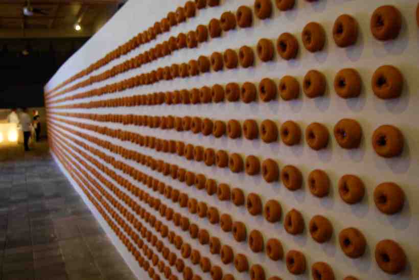 Easy, they dont feed you here! Events, aka VIP parties, are planned from five in the afternoon through three in the morning, back to back, overlapping, six layers deep, some are even called dinner, BUT, they do not actually feed food. Drinks yes, but dinner, not quite. Maybe its the recession, maybe its fashion, but if a plastic cup filled with three shrimp and a hot pepper passes you between seven and ten, count yourself lucky. Except for Fendi’s dinner at Mr. Chow last night. Well kinda, it was dinner for one, so what was I supposed to do while Alastair ate? Well, I drove Michele Oka Doner to a few events that included Jordan, her son, and when I went to pick Al up at Chows the Peking Duck was just being served so I kinda crashed an empty chair and got enough calories to stay within the Basel Miami diet limit, before we returned home. I should have yielded earlier, I thought, to the donut wall, the symbolic dessert installation at the Rubell family collection, a wall with a thousand donuts hung on nails, for the picking.