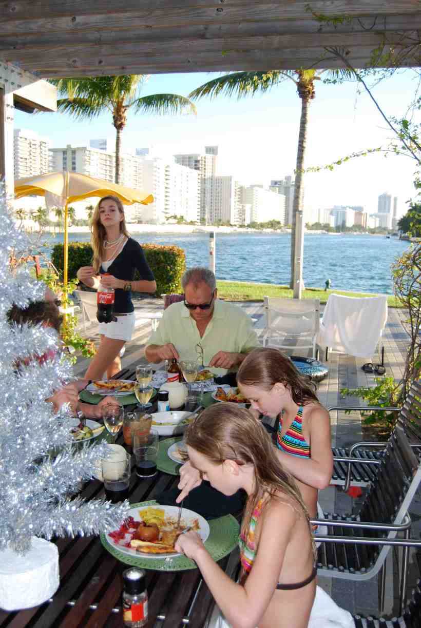 Everyone in our consumer household was content while at the same time contributing to the health of our economy by spending 60% on clothes, 20% on lifestyle, 15% on electronics and 5% on other.  Kiki and Leila got twin bikes and learned to ride them, like good little Dutch daughters, within 30 minutes. Looking heartbreaking in their too-large helmets, long skinny legs and wobbling handlebars. I cooked Christmas lunch while they went to the beach testing the new boogy boards.  I decided to serve the feast by our communal Aqua pool.  Eat out in our bathing suits, our wet hair dripping in the cranberry sauce, I fantasized, but instead we had our first Russian Christmas, because, out of 120 deck chairs on all four sides of the pool a group of super wealthy Russians descended by our dining table with several bottles of champagne, caviar, choice drugs and proceeded to show us what a MERRY Christmas really sounds like (without a nod of recognition or toast in our direction). Fuckem. I had to leave anyway. Pick up Natalie, Iona’s best friend, from  Fort Lauderdale Airport.