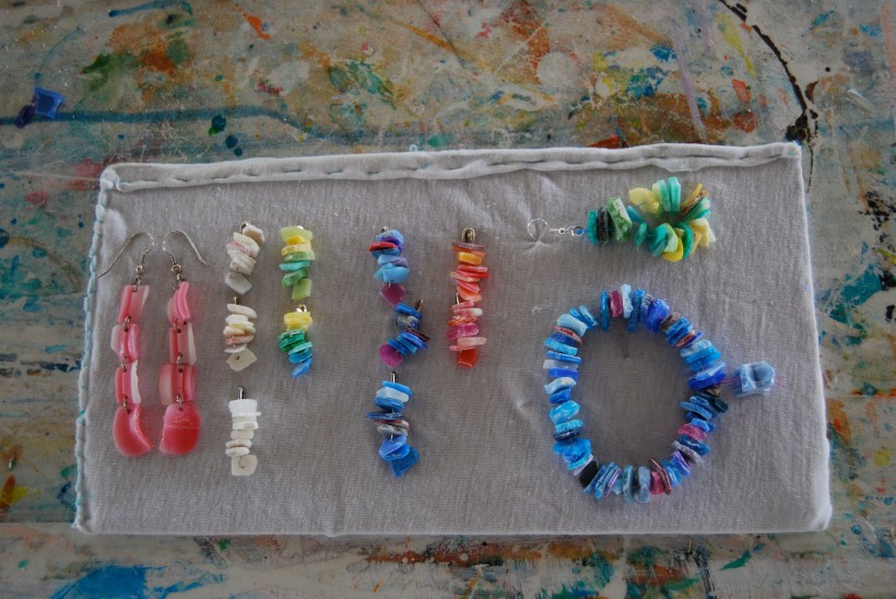 “OK, so yesterday two schools came here, to this studio, girls and boys, some were seven and a few were older, like  ten and one was eleven. And together we went to the beach and we all picked up the prettiest beach plastic, as much we could carry, and brought it back. Then I helped  them make the jewelry, all these things here.”