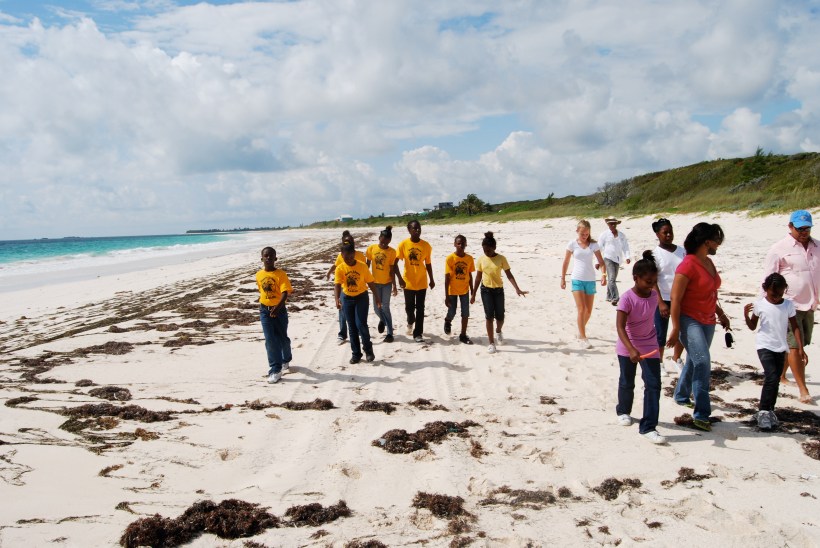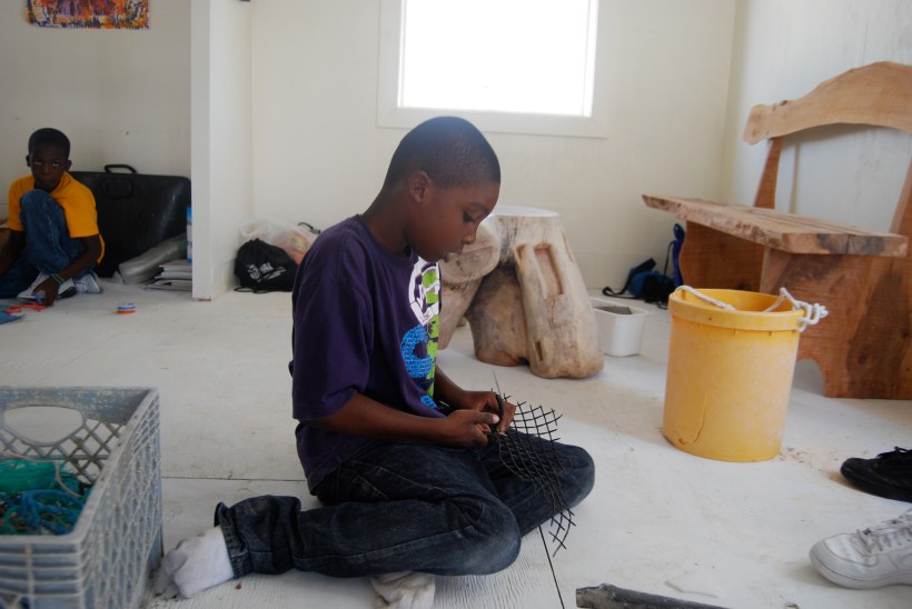I had been flown in by Clint (of community development) who jokes that he met me on the internet. Clint, an avid beach plastic collector with a special attraction to the beach bobbles from girl’s elastic hair ties (“They find me, I don’t find them”) introduced me to  well-known Bahamian artist  Antonius Roberts (his gallery/workshop is in Nassau) who graciously invited me to use his Schooner Bay studio and teach local children where/how to collect beach plastic and turn it into art or jewelry. My wampum fee, with which Clint (a fly fisherman) lured me in, was a wealth of weathered beach plastic bobbles.