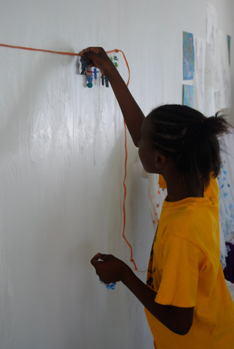 It took more effort to stop them and tidy up than anything else, but finally everyone stood in a neat row and one by one I made them hang their work on the orange rope. Reluctantly most of them gave up one piece for the art show the next day, but I’m sure quite a few pieces were tucked away to go straight home and be proudly shown-off.