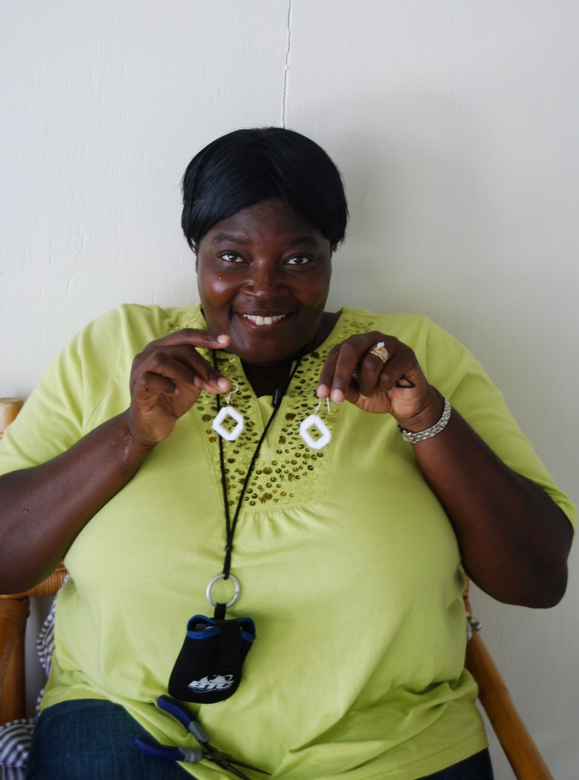 The principal sat off to the side, she’d already finished one set of white earrings for herself and would make three more and a choker.