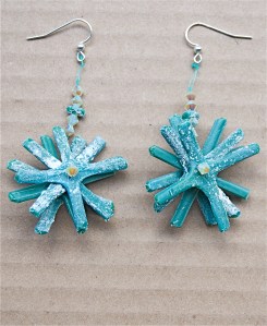 Friday was earring day and everyone was excited to learn. I prepped crosses by cutting old washed-up lobster traps, bait pouches and one red and one orange crate. Zach drilled holes in their centers. I laid out the findings and gems.