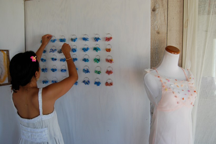 I took over the Beach House Boutique which belongs to my friend Jude (she had generously donated the space for the day.) Usually the shop is a cornucopia of treasures, a feast for the eyes, a trove of endless fashion goodies- something for everyone, but I had planned to strip it down to a white, bare, breezy gallery space. A place where the colors of a new generation of beach plastic would speak loudly to an audience that came from all over to celebrate Earthday in Eleuthera.