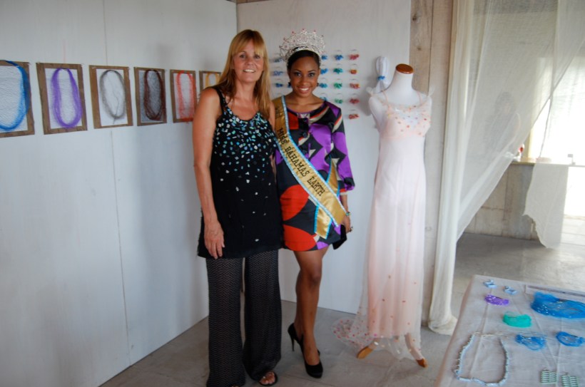 It was the welcome party for a weekend of Earthday Festivities in Eleuthera and I was the featured guest with a gallery full of Plastic is Forever – earrings, bracelets, necklaces, scarves, tees, kerchiefs, stationary, and even a pair of pants and a “red carpet” dress.